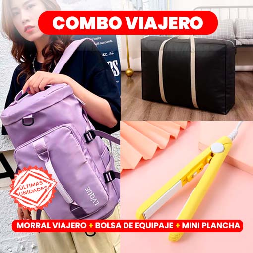 COMO VIAJERO es el combo ideal que incluye un práctico morral viajero, una funcional bolsa de equipaje y una mini plancha para el cabello, todo al precio de un solo producto.